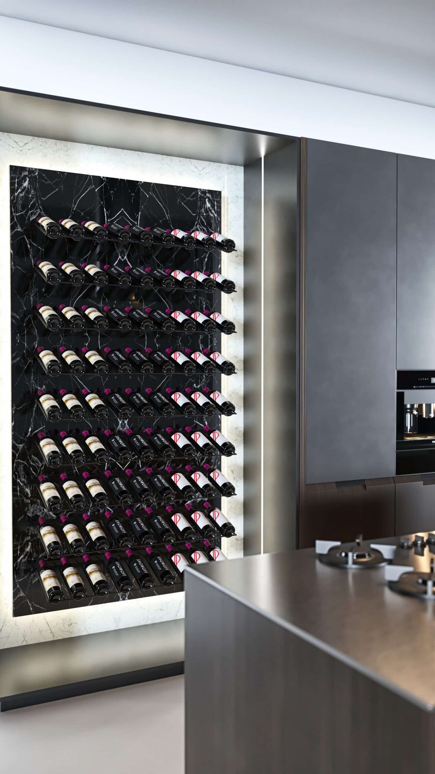 Kit mural design effet cascade pour 81 bouteilles. Présentation inclinée moderne et haut de gamme pour une meilleure visibilité sur vos étiquettes. 5 finitions disponibles.